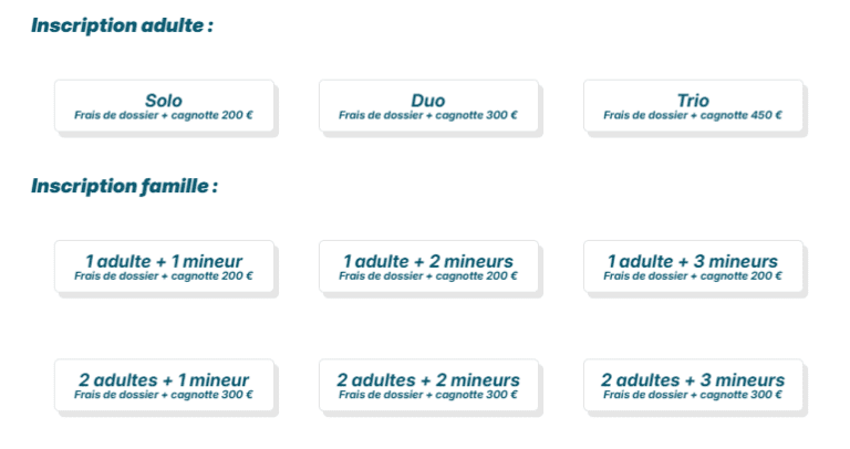 - 4. Puis-je créer une Equipe et ajouter immédiatement mes co-équipiers ?Oui. Choisissez l’offre de votre choix (duo, trio, famille). Puis, à la fin du parcours d’inscription, cliquez sur le bouton « Ajouter quelqu’un d’autre » pour inscrire votre ou vos coéquipier(s). Vous pourrez alors payer les frais de dossier de chaque participant en une seule fois.